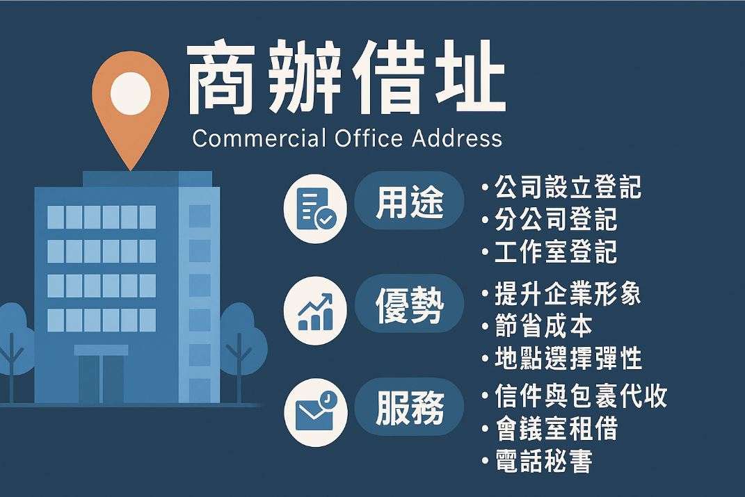 商辦借址是指「借用一個合法可用於商業登記的地址」,用來設立公司、工作室或商號,並進行稅務登記與政府資料註冊。通常不需實際進駐辦公室,而是以地址作為法律與行政用途使用。